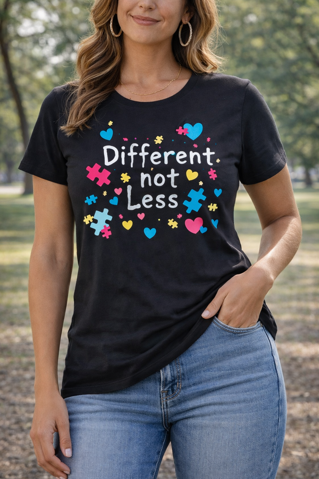 Spread a powerful message of acceptance and inclusion with this “Different Not Less” Autism Awareness T-shirt. Featuring colorful puzzle pieces and heart designs, this tee represents love, understanding, and celebrating differences.